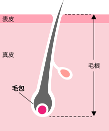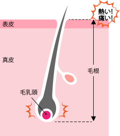 現在生えている毛、またはいずれ抜け落ちる毛に対して退所する方法です。処理しても、毛乳頭に達する前に毛が焼き切れてしまうため、毛乳頭に「埋もれ毛」として残ってしまい、再生してしまいます。高熱を使って処理するため、痛みを伴い、やけどによる炎症・シミという危険と隣り合わせです。2~3ヶ月に1度しか処理できません。